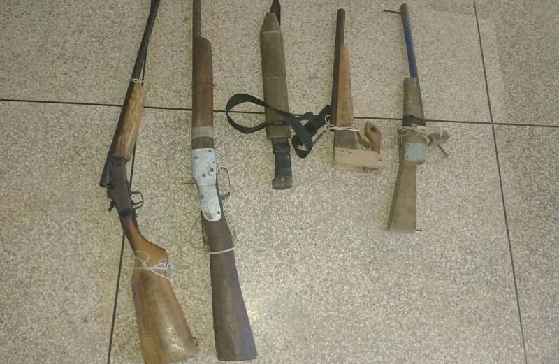 Foram apreendidas uma espingarda calibre 32 e três simulacros de arma de fogo com o suspeito.
