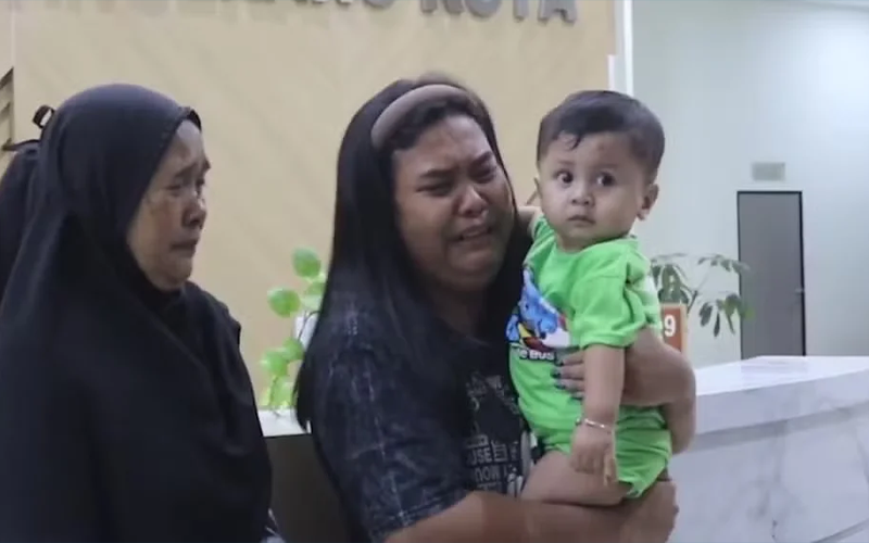 Mãe da criança chora ao reencontrar o filho (Foto: Divulgação/Polrestro Tangerang Kota)