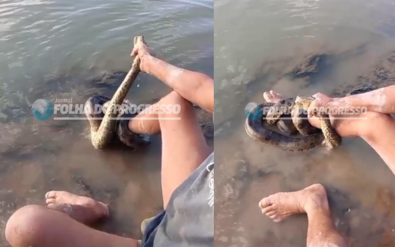 Novo Progresso (PA) – Um vídeo que circula em grupos de WhatsApp da região de Novo Progresso mostra o momento em que um homem identificado como Silvano é surpreendido por uma cobra sucuri às margens do rio Jamanxim.