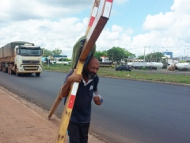 Em meio aos mais de 60 mil veículos que trafegam diariamente pela BR-163/364, em Mato Grosso, um homem carregando uma cruz com cinco metros de comprimento chama a atenção por onde passa. Nos últimos dias, a principal rota de escoamento da safra mato-grossense virou a via crucis do pernambucano Paulo Cícero de Lima, 56 anos, que veio de Itapevi (SP) e pretende chegar aos Estados Unidos.