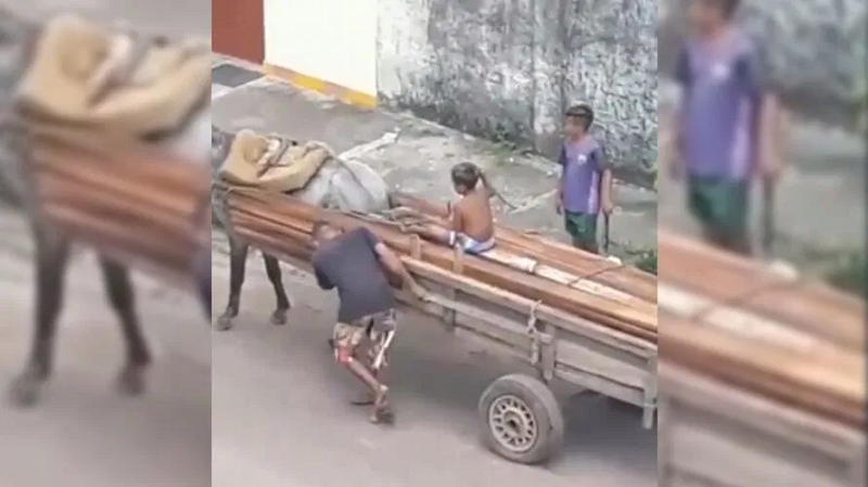 As imagens ainda mostram o homem tentando fazer o animal puxar a carga, e mesmo com ele retirando boa parte da madeira da carroça, para diminuir o peso, o animal não consegue sair do lugar.