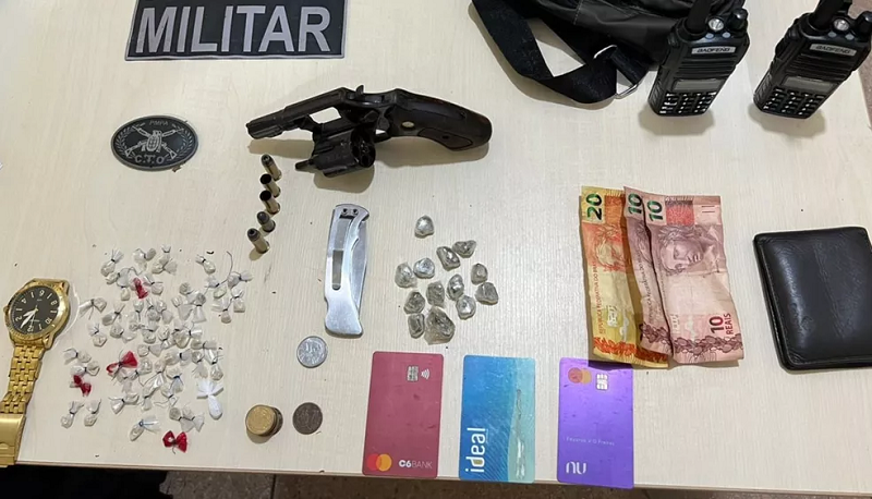 A PM apreendeu uma carabina, um revólver, munições, dois rádios de comunicação, R$ 40 em espécie, uma porção de cocaína, papelotes de maconha, porções de oxi, um relógio de pulso, um canivete e cartões de bancos. Não foi detalhado onde estavam os materiais apreendidos.
