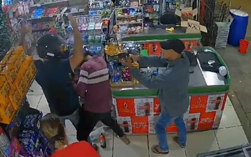 A ocorrência foi na noite desta quarta-feira (24). Imagens mostram quando dois dos três homens envolvidos no crime renderam uma funcionária e o policial penal dentro de uma mercearia no conjunto Benjamim Sodré. Os criminosos roubaram a arma do agente e fugiram logo em seguida em direção ao conj. Sideral.