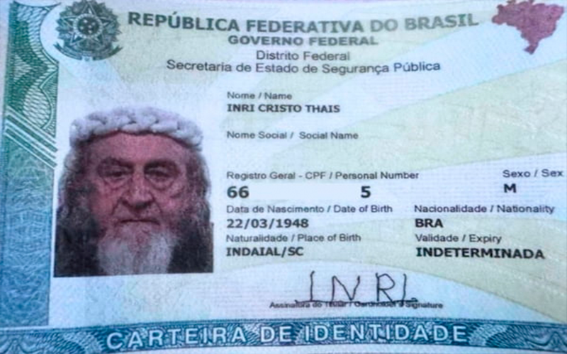 Na nova carteira de identidade, o líder religioso assina como “Inri” e aparece com uma coroa de espinhos de plástico na foto três por quatro. Como ele tem mais de 65 anos, o documento não possui prazo para expirar.