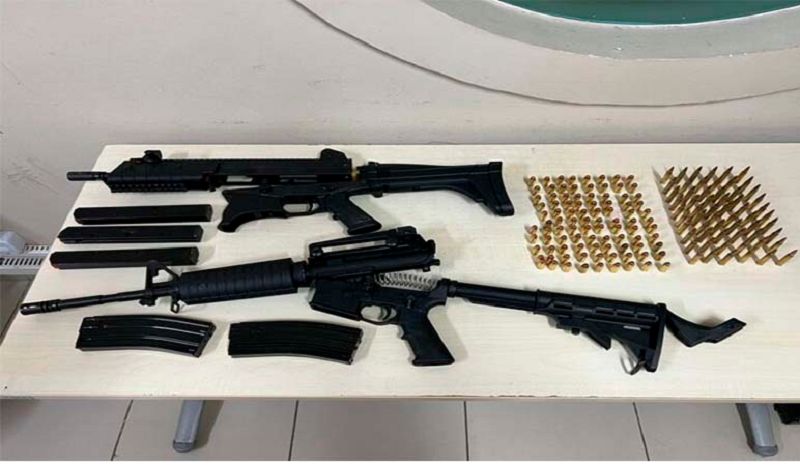 Durante buscas no veículo, foram encontrados dentro do estofamento do banco traseiro, um fuzil calibre 556 e uma carabina calibre .40, além de cinco carregadores e farta munição.