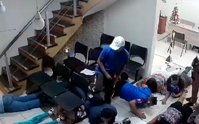 Câmeras de segurança do local registraram toda a ação da dupla. Um deles, que usa boné branco e camisa azul, já entrou no local com a arma em punho. Ele rende uma funcionária que está na recepção e os clientes e manda todos deitarem no chão com as mãos na cabeça. Momentos depois, entra o segundo suspeito, que usa camisa branca e está de capacete de moto. O homem de camisa azul vai até a porta de uma sala e força a entrada. Uma funcionária que está do lado de dentro tenta impedir que o homem consiga entrar, mas não consegue.