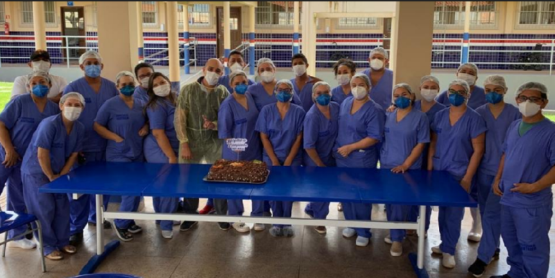 Na manhã desta segunda-feira (22), a equipe plantonista foi surpreendida com um bolo em comemoração às mais de 100 altas, ofertado pelo Instituto Social Mais Saúde (ISMS), que administra o HCS, como forma de comemorar o empenho de cada colaborador que não mede esforços para aplicar suas habilidades profissionais e o trato humanizado todos os dias na luta contra a COVID-19. “Essas altas são o reflexo do trabalho de cada um, todos são verdadeiros heróis” concluiu o gestor administrativo da Unidade, Marcelo Henrique.