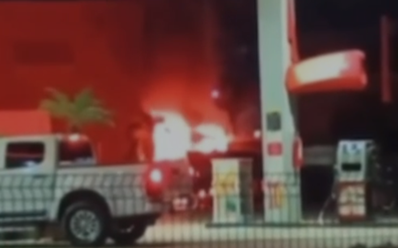 Foto: Reprodução | Caso ocorreu na noite desta segunda-feira (21) e foi registrado por pessoas que estavam no posto de gasolina. Motorista do caminhão sofreu queimaduras graves e foi encaminhado para hospital.