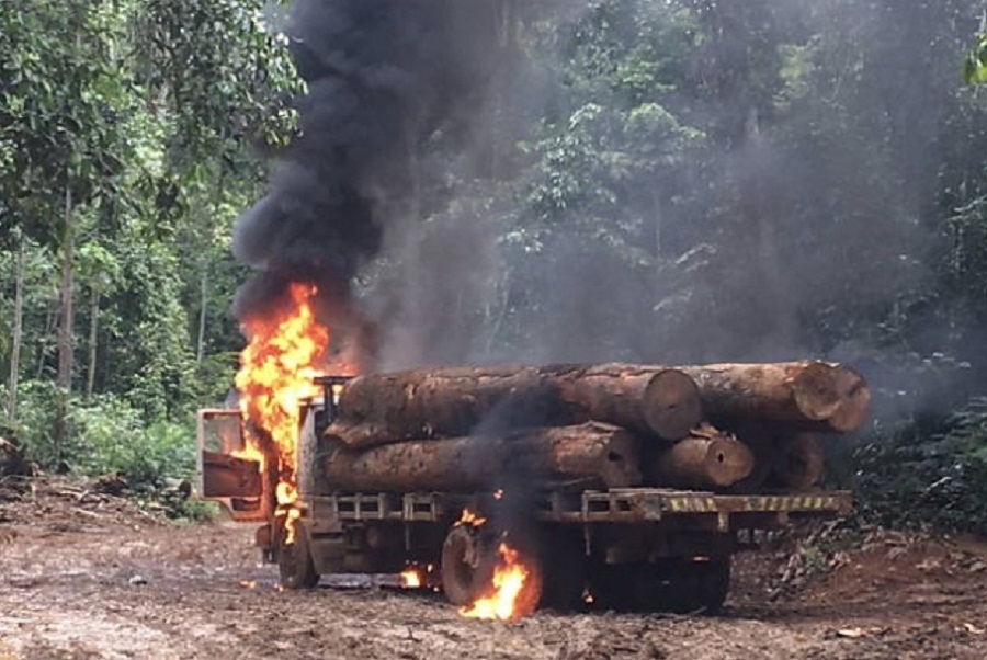 Em apenas um dos quatro dias de fiscalização na divisa entre Mato Grosso e Rondônia, foram incendiados dois caminhões para transporte de madeira, um skidder (trator para arrasto de toras), uma camionete Mitsubishi L200 e uma pá carregadeira –prejuízo de pelo menos R$ 600 mil aos madeireiros.