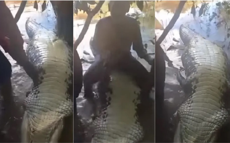 Nas imagens, aparecem dois homens ao lado do animal, que já está morto e virado de peito para cima. Um dos pescadores chega a bater na barriga do jacaré e depois monta no animal ao comemorar o abate.