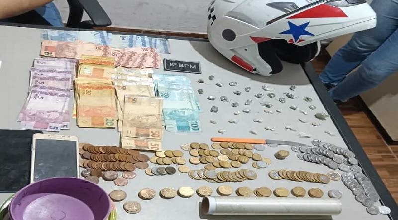 Segundo a Polícia Militar, na casa havia 24 porções de maconha, 15 de oxi, além do dinheiro.
