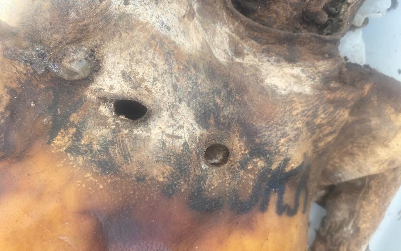 O corpo encontrado e estado avançado de decomposição, tatuagem foi encontrada no peito, perna e no braço direito, com perfuração de projetil de arma de fogo pelo corpo (perfurações).