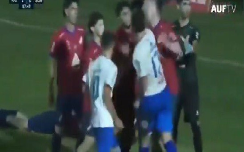 Durante confusão entre os atletas no gramado de jogo, o jogador Mário González, do Soriano, desferiu um soco e nocauteou Guinchón, do Paysandú. A agressão foi tão forte que a vítima caiu desacordada no chão.