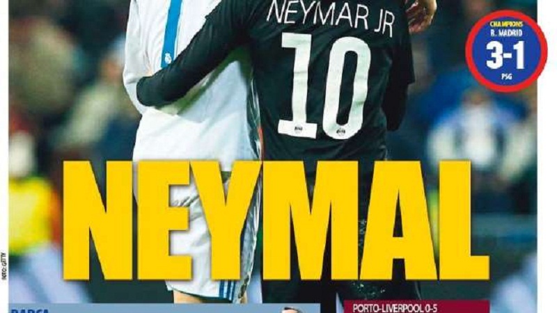 Por ESPN – Capa do jornal Mundo Deportivo de 15 de fevereiro de 2018 (Foto Reprodução) -Seja pelo seu passado glorioso no Barcelona ou pelas especulações que o ligam ao Real Madrid no futuro. A volta de Neymar à Espanha era muito aguardada. O brasileiro foi bastante participativo, mas não conseguiu marcar e nem impedir a derrota do Paris Saint-Germain por 3 a 1 para o Real Madrid, de virada, no Santiago Bernabéu.