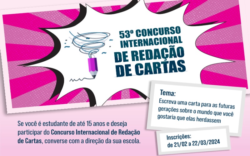 O tema deste ano é: “Escreva uma carta para as futuras gerações sobre o mundo que você gostaria que elas herdassem”. As inscrições devem ser realizadas pelas escolas que selecionam, entre as redações de seus estudantes, até duas cartas para representá-las.
