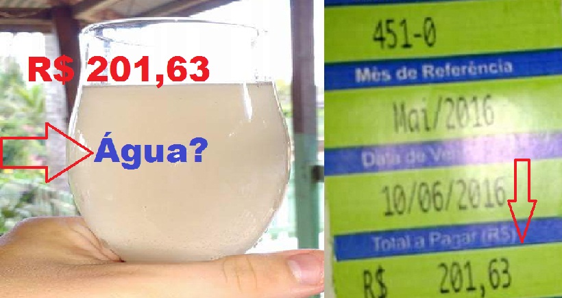 Foto (Facebook) mostra água barrenta com a conta do valor em real para consumir agua suja, disse internauta.