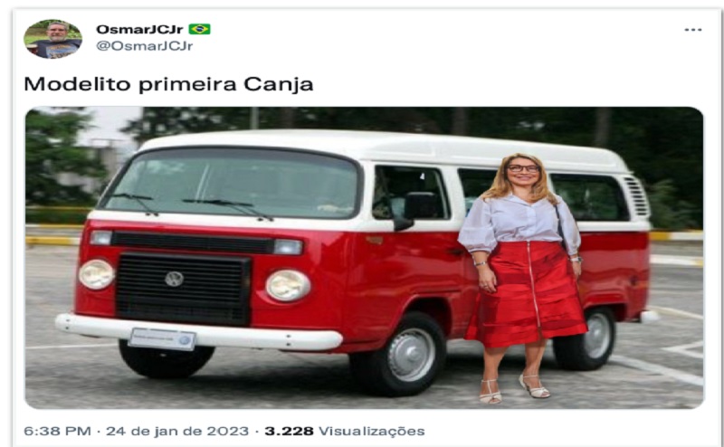 Internautas bolsonaristas criticaram a escolha de roupa de Janja para reunião com presidente argentino; uma das fotomontagens compartilhadas compara a roupa da primeira-dama com uma Kombi