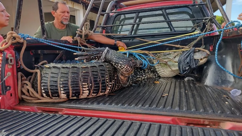 O jacaré foi capturado pela equipe e preso com cordas com a ajuda de moradores da região.