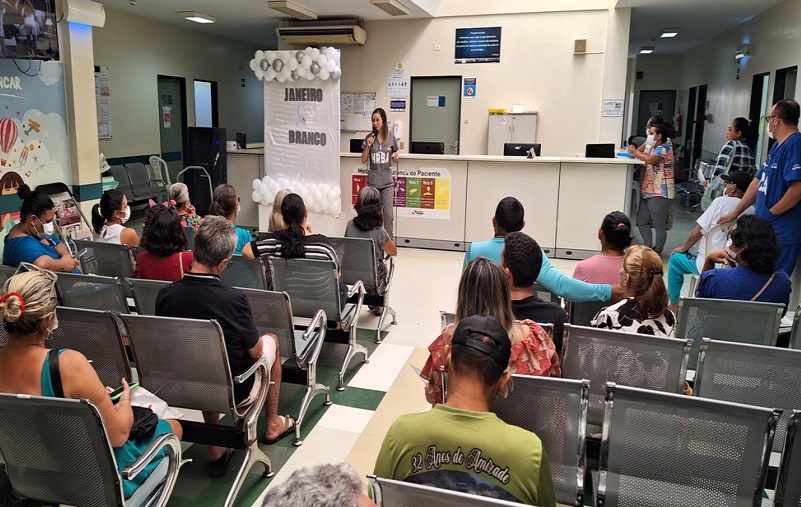 Pacientes e acompanhantes que esperavam no setor de ambulatório da unidade assistiram a uma palestra educativa alusiva à campanha Janeiro Branco, que tem o objetivo de alertar para os cuidados com a saúde mental e emocional da população, a partir da prevenção das doenças decorrentes do estresse, como: ansiedade, depressão e pânico.