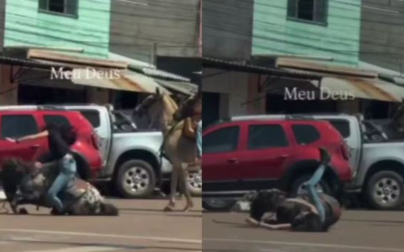Momento em que a jovem caiu do pônei foi filmado por pessoas que acompanharam a cavalgada em Altamira. — Foto: Reprodução / Redes sociais