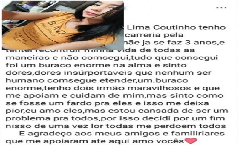 Andreza Lima Coutinho , popularmente conhecida como “Dreza”, de 22 anos, natural de Itaituba, residente em Novo Progresso, tentou suicídio após deixar mensagem no facebook.