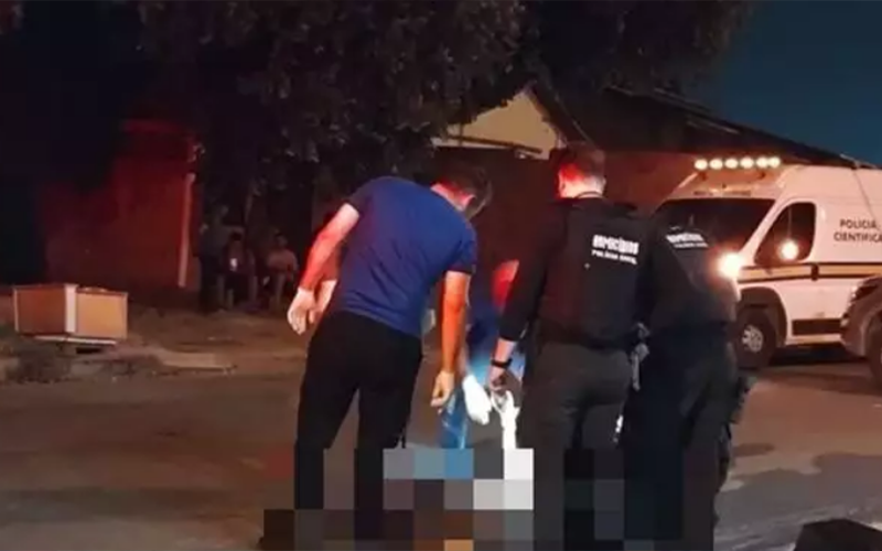 A imagem mostra o corpo de Luan Walace Ferreira Almeida, de 24 anos, rodeado por policiais civis e peritos criminais. (Foto: Reprodução | Correio de Carajás)
