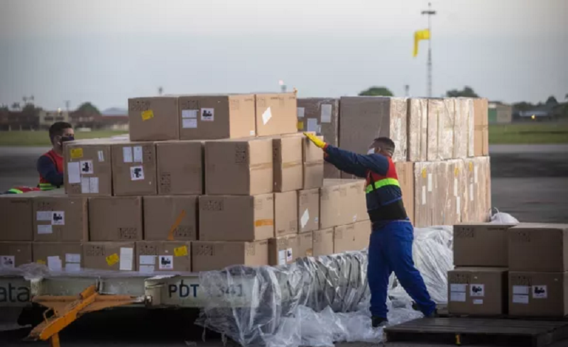 Respiradores comprados da China sendo descarregados no Pará. — Foto: Marco Santos/Agência Pará