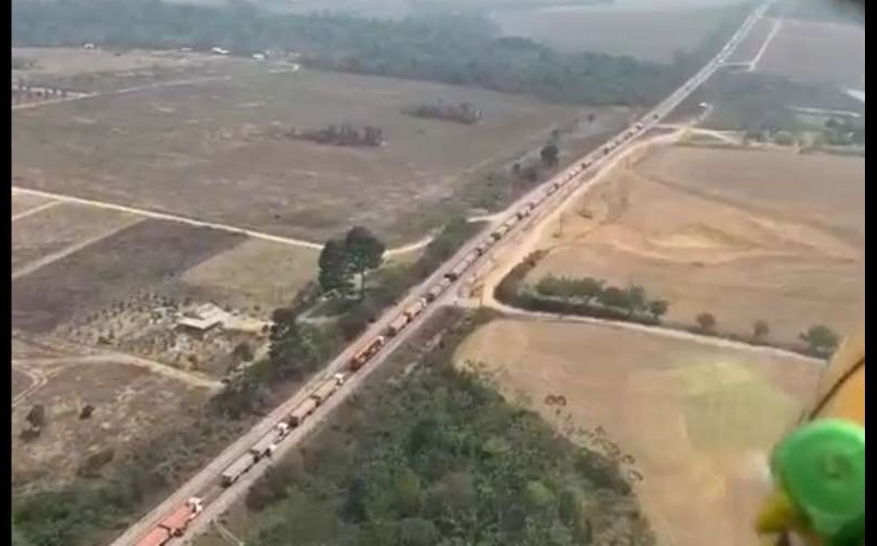 Caminhões parados na rodovia – (Foto:Reprodução) Os indígenas deverão promover de forma imediata o desbloqueio de trecho da rodovia BR-163 em Novo Progresso no Pará.