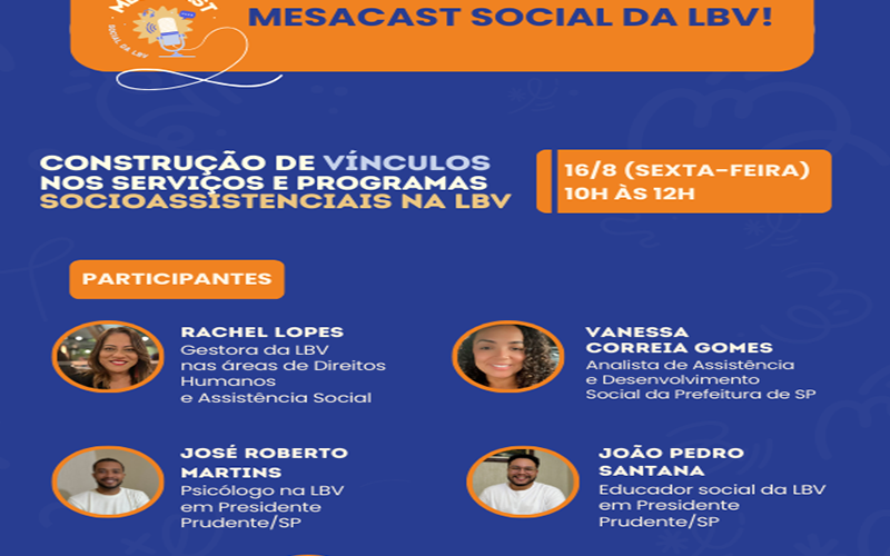 A ser realizado pela Legião da Boa Vontade, no próximo dia 16 de agosto (sexta-feira), das 10 às 12 horas, o MesaCast, evento on-line e gratuito, abordará o tema “Construção de vínculos nos serviços e programas socioassistenciais na LBV”. Este encontro dinâmico proporcionará um espaço para compartilhar ideias e opiniões sobre o assunto. A transmissão será ao vivo pelo YouTube no perfil @LBVBrasil.