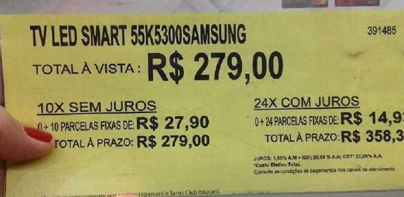 Além da possibilidade de levar à vista a TV por R$ 279, o supermercado dava a opção de parcelamento em dez vezes sem juros – ou 24 vezes, com acréscimo.