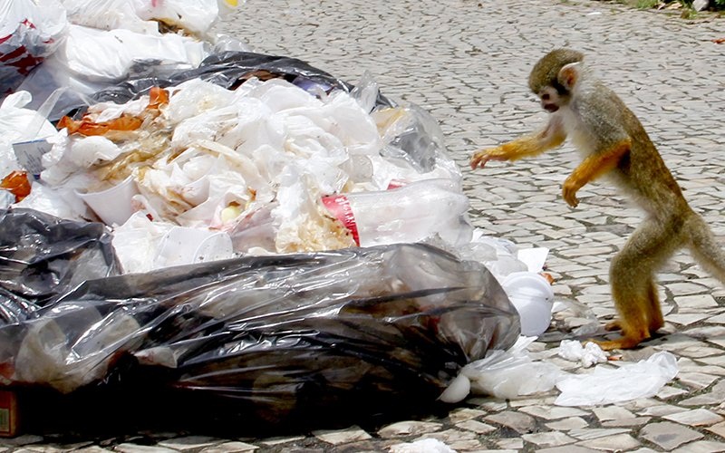 Os restos de lixo espalhados pela calçada do Bosque Rodrigues Alves, no bairro do Marco, em Belém, atraíram os macacos que aproveitaram para se alimentar e remexer nas sacolas plásticas, algumas inclusive abertas.