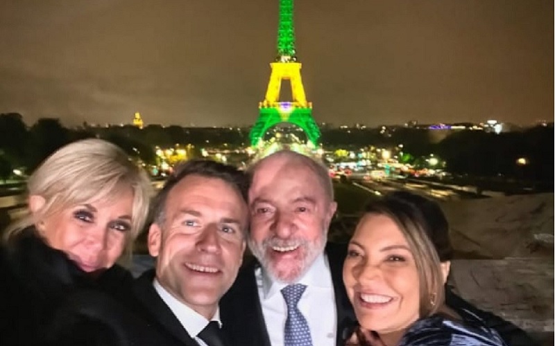Nesta quinta-feira (5/6), o presidente da França, Emmanuel Macron, postou uma selfie em uma rede social, acompanhado por Luiz Inácio Lula da Silva (PT), Janja da Silva e pela esposa, Brigitte Macron. Ao fundo, é possível ver a Torre Eiffel, um dos símbolos de Paris, iluminada com as cores do Brasil.