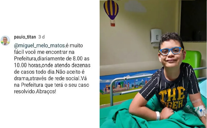 Após uma mãe denunciar pelas redes sociais o atraso de quatro meses na entrega de um medicamento para o filho de 9 anos, que possui doença rara, o prefeito da cidade em que mora, Castanhal, na Grande Belém, Paulo Titan (MDB), respondeu de forma debochada: “Não aceito é drama através de rede social”. O medicamento chega a custar mais de R$ 300.
