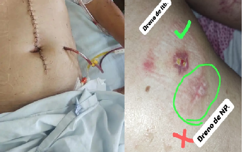 Nesta semana Sra. Marineusa (Baiana) , mãe do Thiago da Silva de 36 anos, postou nas redes um relato com imagem mostrando o ferimento do dreno em local errado. (veja abaixo)