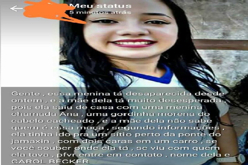Segundo a postagem da Mãe nas redes sociais a filha Carol Becker, foi vista em um carro com dois rapazes próximo a ponte do rio Jamanxim, e não retornou mais para casa , a mãe pede ajuda para encontrar a filha que souber do paradeiro da jovem favor ligar para o nº (93) 98408-3201.