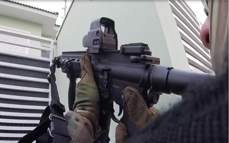 Agente da Polícia Federal mira fuzil contra a janela do quarto do traficante “Fantasma”, que foi preso em Novo Progresso, sudoeste do Pará (Foto: Reprodução)