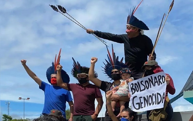Com faixas e cartazes, os manifestaram também exigiram a retirada de garimpeiros dos territórios indígenas de Roraima e a aceleração na imunização contra a Covid-19.