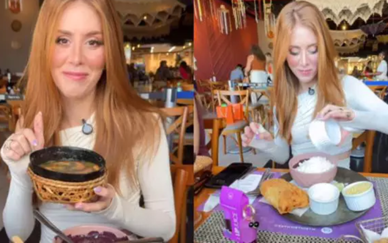“A comida está gostosa”, comentou a maquiadora enquanto se servia na mesa, que também incluía peixe frito e tacacá.