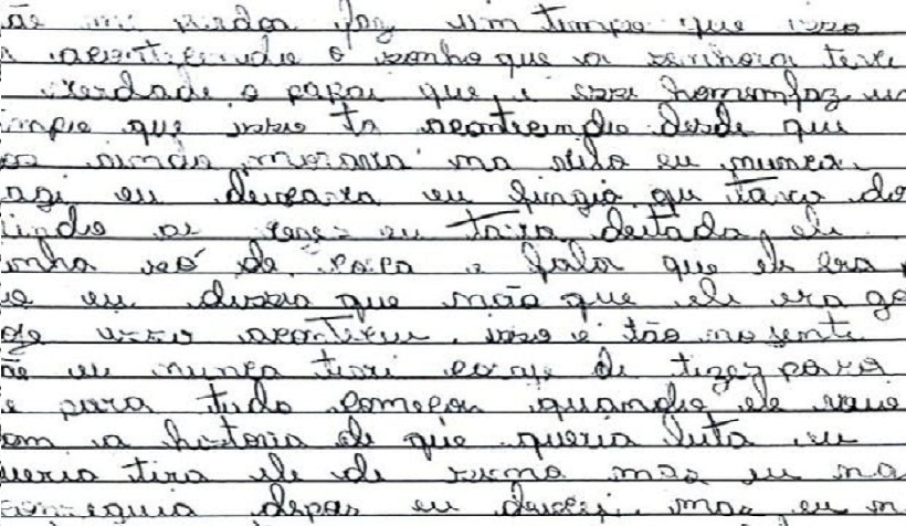 “Mãe, me perdoa. Faz um tempo que isso está acontecendo […] hoje isso aconteceu, isso é tão nojento. Mãe, eu nunca teria coragem de dizer para ele parar. Tudo começou quando ele veio com uma história de que queria lutar. Eu queria tirar ele de cima de mim, mas eu não conseguia, depois eu deixei, mas na minha mente eu nunca quis, ele falava para eu não sair, só que me doía muito mas eu sempre deixava. […] Eu não queria olhar na cara dele, mas eu tinha que fingir que estava tudo normal. Eu não queria mais escutar no jornal coisa (sobre) abuso porque me doía muito. Eu já tinha escrito outra carta, só que não tive coragem de entregar. Eu pedi a Deus coragem para entregar essa. Por isso eu ficava com raiva de repente, nem ele nem a senhora me viram chorando, mas eu choro muito”, diz um trecho da carta.