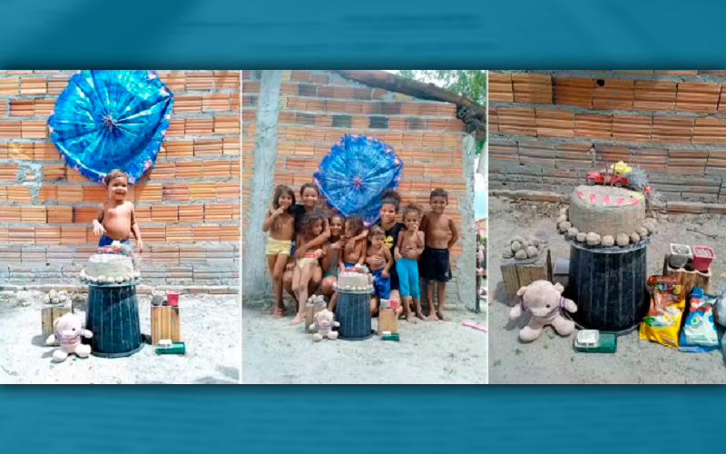 Sem a mãe ter como fazer uma festinha, crianças da vizinhança se uniram para fazer um bolo e docinhos de areia. O importante era não deixar de comemorar mais um ano de vida do menino.