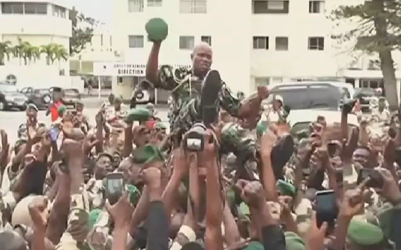 Imagem de soldados gaboneses carregando o general Brice Oligui Nguema, no dia 24 de agosto. Chefe da guarda presidencial do presidente deposto, Nguema foi carregado por centenas de soldados que o proclamaram líder nesta quarta-feira, segundo imagens transmitidas pela televisão estatal – (Foto:Gabão 24/AFP).