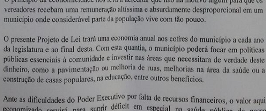 De acordo com o projeto, a economia com a redução salarial poderá ser investida em políticas públicas efetivas à sociedade, “como pavimentação nas ruas, melhorias na saúde, construção de casas populares, educação e outros”, diz trecho da justificativa do projeto.
