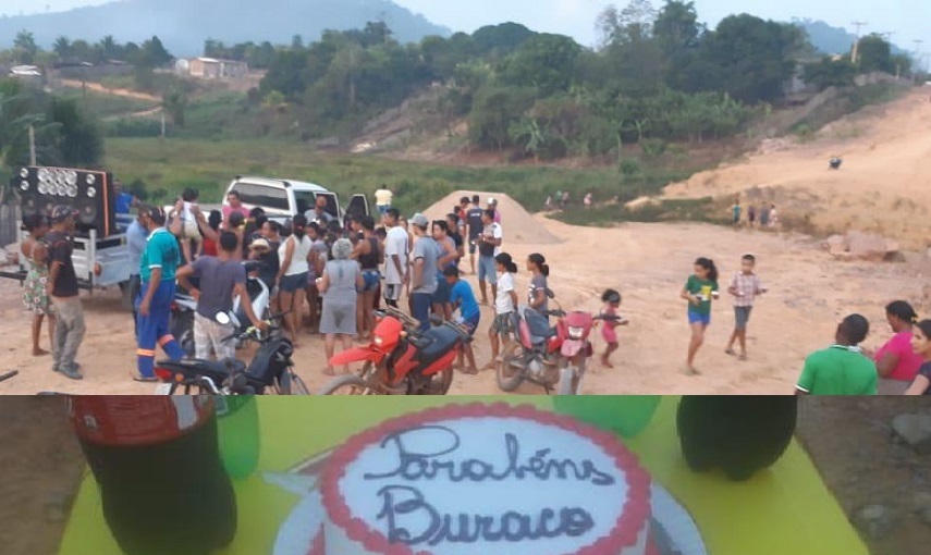 Uma festa realizada pelos moradores da comunidade de Bela Vista do Caracol distrito de Trairão, celebrou um aniversariante inusitado. Com direito a bolo , som mecânico ,refrigerantes e fogos de artifícios, os moradores “comemoraram o aniversário” de um buraco na Avenida Principal, que da acesso ao bairro Planalto daquele distrito. Segundo eles, fez um (1) ano sem solução.