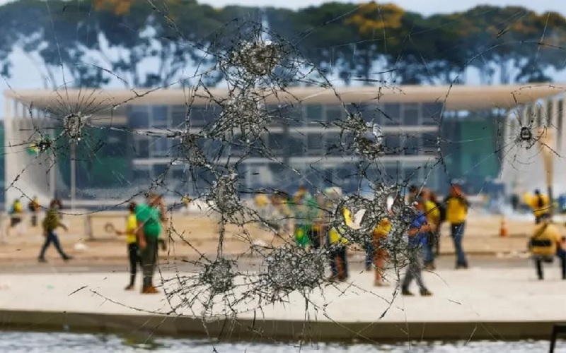 Criminosos são vistos através de janela vandalizada do Palácio do Planalto, em Brasília, em 8 de janeiro de 2023 — Foto: Adriano Machado/Reuters