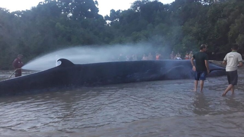 Moradores da comunidade também se mobilizaram para tentar ajudar no resgate do animal. Eles jogaram água do rio para tentar hidratar a baleia que tem cerca de 5 metros. Acabou morrendo.