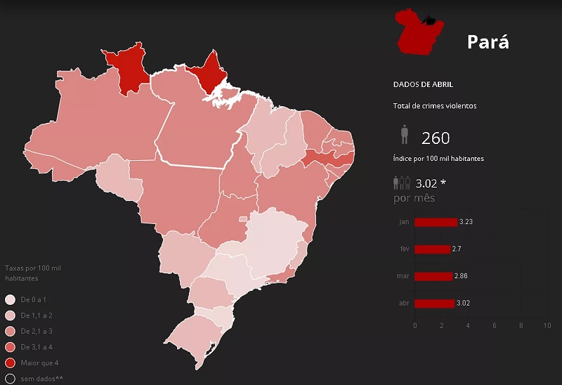 Somente no mês de abril, o Pará registrou 260 mortes violentas, atrás apenas de São Paulo com 290 casos; de Pernambuco, com 309; do Rio de Janeiro, registrando 368 mortes; e da Bahia com 442.