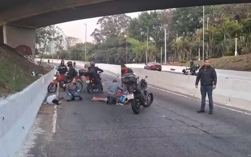 Uma moto foi fechada por um carro e o piloto e o garupa dela caíram de uma altura aproximada de 5 metros da Ponte do Morumbi, na Zona Sul de São Paulo. A motocicleta onde as vítimas estavam ficou presa no alto, no vão da ponte, e o motorista do automóvel fugiu sem prestar socorro às vítimas.