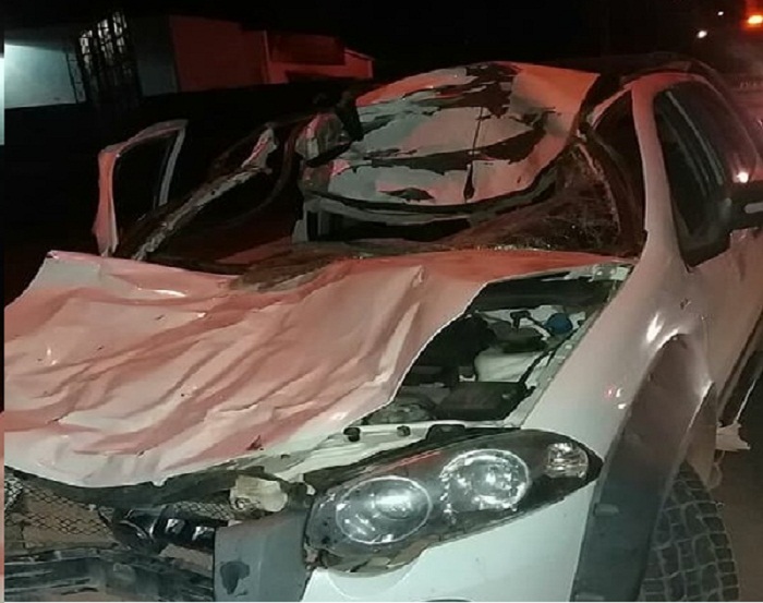 Carro ficou destruído após atropelar 2 animais e 6 pessoas em Guarantã do Norte (Foto: Divulgação)