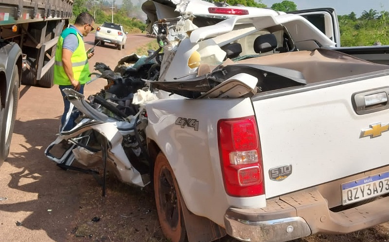 Acidente-Conforme informações (não oficial) Thiago Silva, seguia sentido Miritituba/Novo Progresso em uma camionete Chevrolet S10 placa QZY3A93,de cor branca, quando foi surpreendido na rodovia federal, por uma carreta, que seguia na outra direção em ultrapassagem acabou passando por cima do veículo.