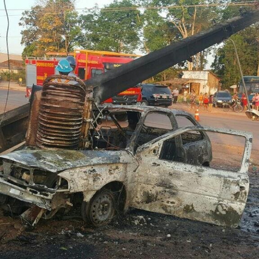 Motorista perde controle, atinge poste e carro pega fogo na BR-163